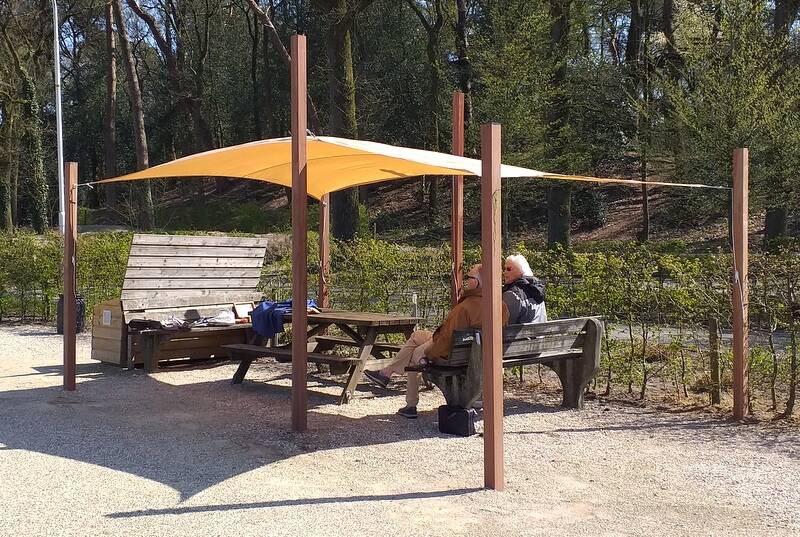 Riemer en Charles zijn weer druk in de weer geweest om onze baan te verfraaien met een mooi zonnescherm. Zodat we met warm weer lekker in de schaduw kunnen zitten.